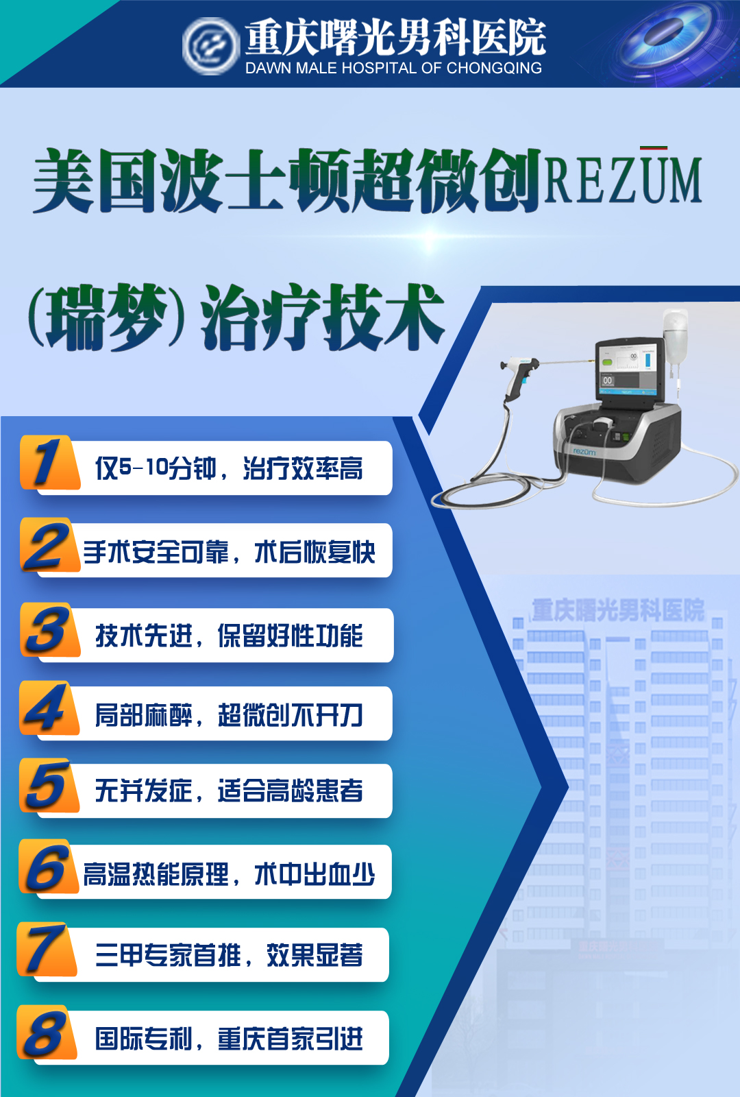 重庆曙光男科医院引进全球领先的美国波士顿瑞梦前列腺热蒸汽消融系统,能够有效的解决男性前列腺炎问题。其基本原理是利用高温水蒸汽的热能释放,使前列腺增生的组织细胞瞬间坏死,并被人体自然吸收,从而缩小前列腺体积,改善排尿困难等症状。相比其他微创手术治疗方式,热蒸汽疗法主要有如下优势:一是手术时间短,治疗效率高;二是微创化治疗,并发症风险低,术后恢复快;三是手术安全性高,特别适合合并基础疾病的高龄患者,并且无需停用阿司匹林等抗凝药物,降低了原有疾病加重的风险。